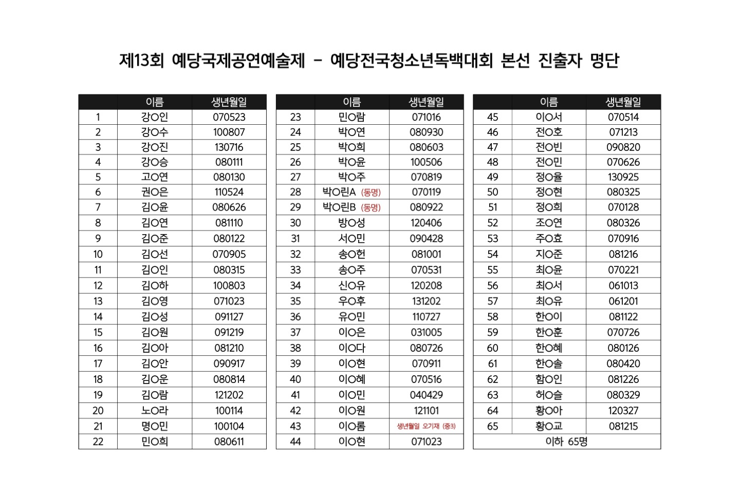 ※ 본선 진출자 발표 자료에 한하여 독백대회 참가자의 학교명은 블라인드 처리하며, 최종 본선 평가 종료 후에 수상자에 한하여 공개함